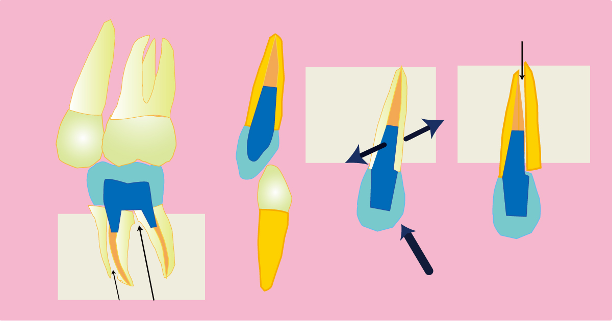 ハセツ線の方向や部位、歯根実質の健全性により抜歯や一部保存の選択がなされます。 接着技法には限界があります。